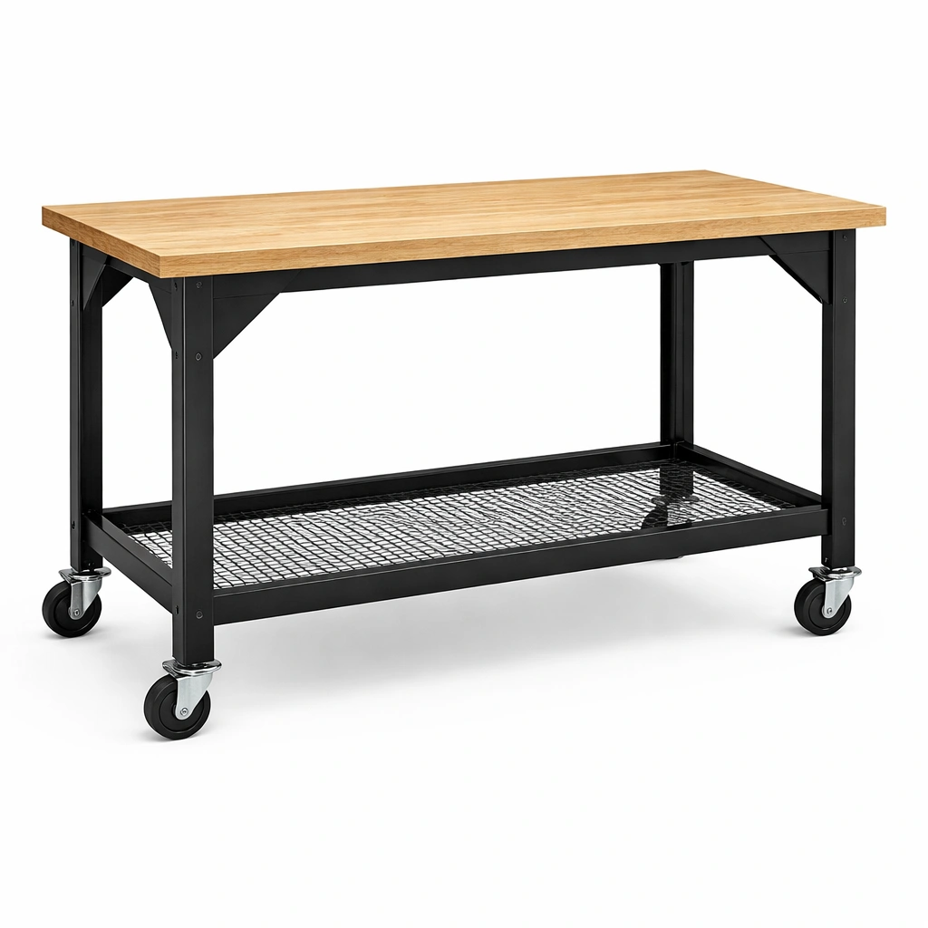 Banco de trabajo de madera de roble y acero negra con ruedas 150x60x90 cm